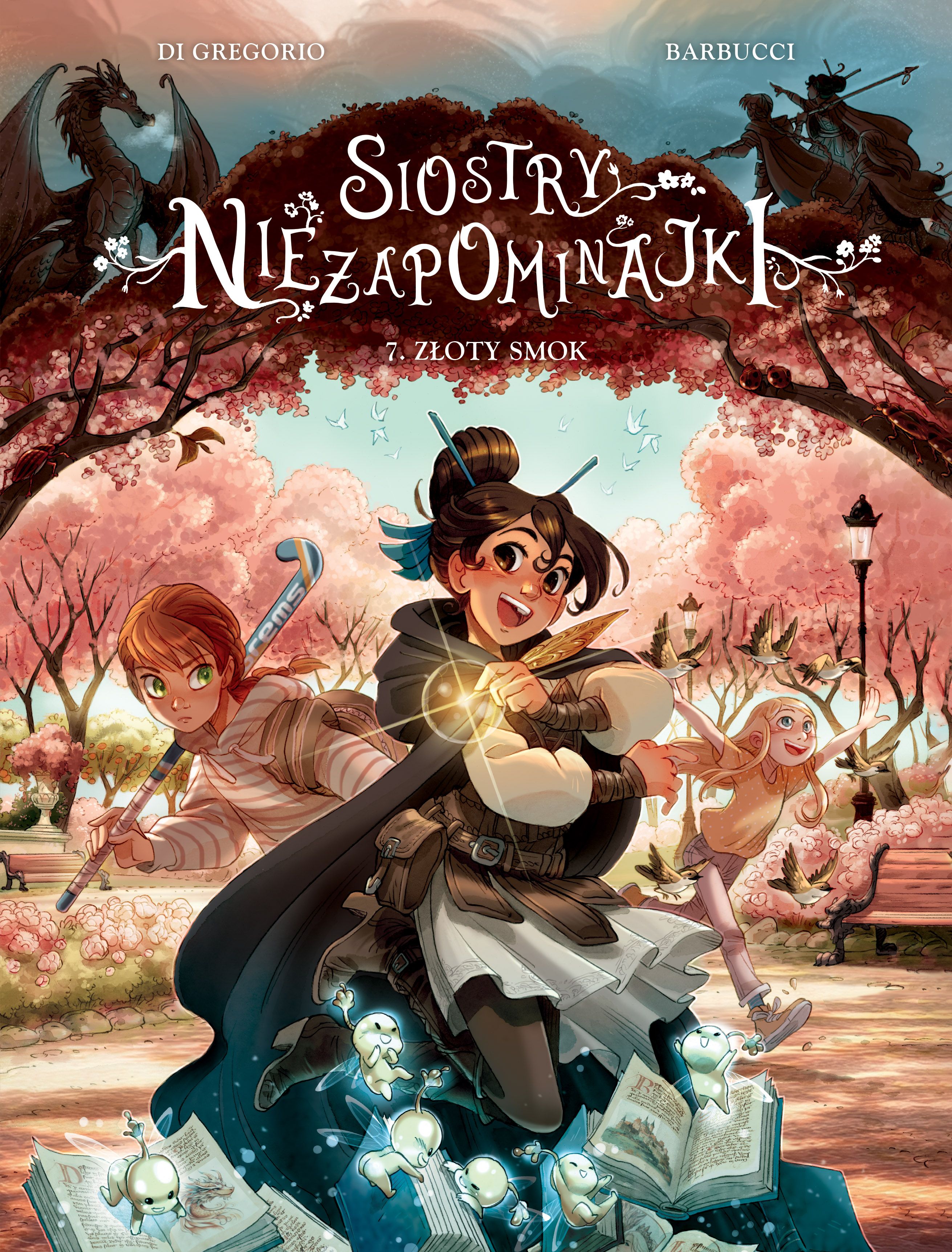 Najnowszy tom mądrej, zaskakującej i wzruszającej opowieści o trzech siostrach Niezapominajkach. Dziewczynki są bardzo zajęte. Sara gra w turnieju sportowym, Kasjopeja pisze opowiadanie na konkurs, a Lucilla pomaga w schronisku dla zwierząt. I właśnie wtedy orientują się, że z miejskiego parku zniknęła rzeźba smoka, którą uznawały za totem swojego Klubu Trzech Sióstr! Kto ją ukradł? Rozpoczynają śledztwo, które doprowadzi je do ciekawych wniosków na temat tak ważnych spraw jak ambicja, osiąganie celu i przyjaźń. Może też uda im się uratować dzielnicową księgarnię, a wraz z nią prawdziwą magię słów? Autorami serii są dwaj Włosi – scenarzysta Giovanni Di Gregorio („Brancaccio: chronique d`une mafia ordinaire”, „Last Travel Inc.”, „Monster Allergy”) oraz rysownik i scenarzysta Alessandro Barbucci, znany w Polsce przede wszystkim jako współautor bestsellerowego cyklu „W.I.T.C.H.” i serii science fiction „Sky Doll”.